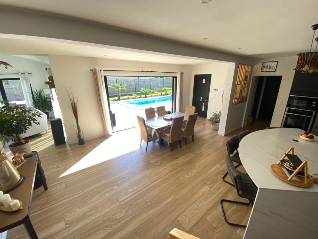 Profitez des beaux jours sur la grande terrasse ensoleillée ou plongez dans la piscine équipée d’un volet électrique pour des moments de détente inoubliables. La maison dispose également d’un garage et de stationnement extérieur pour garer vos véhicules en toute sécurité.